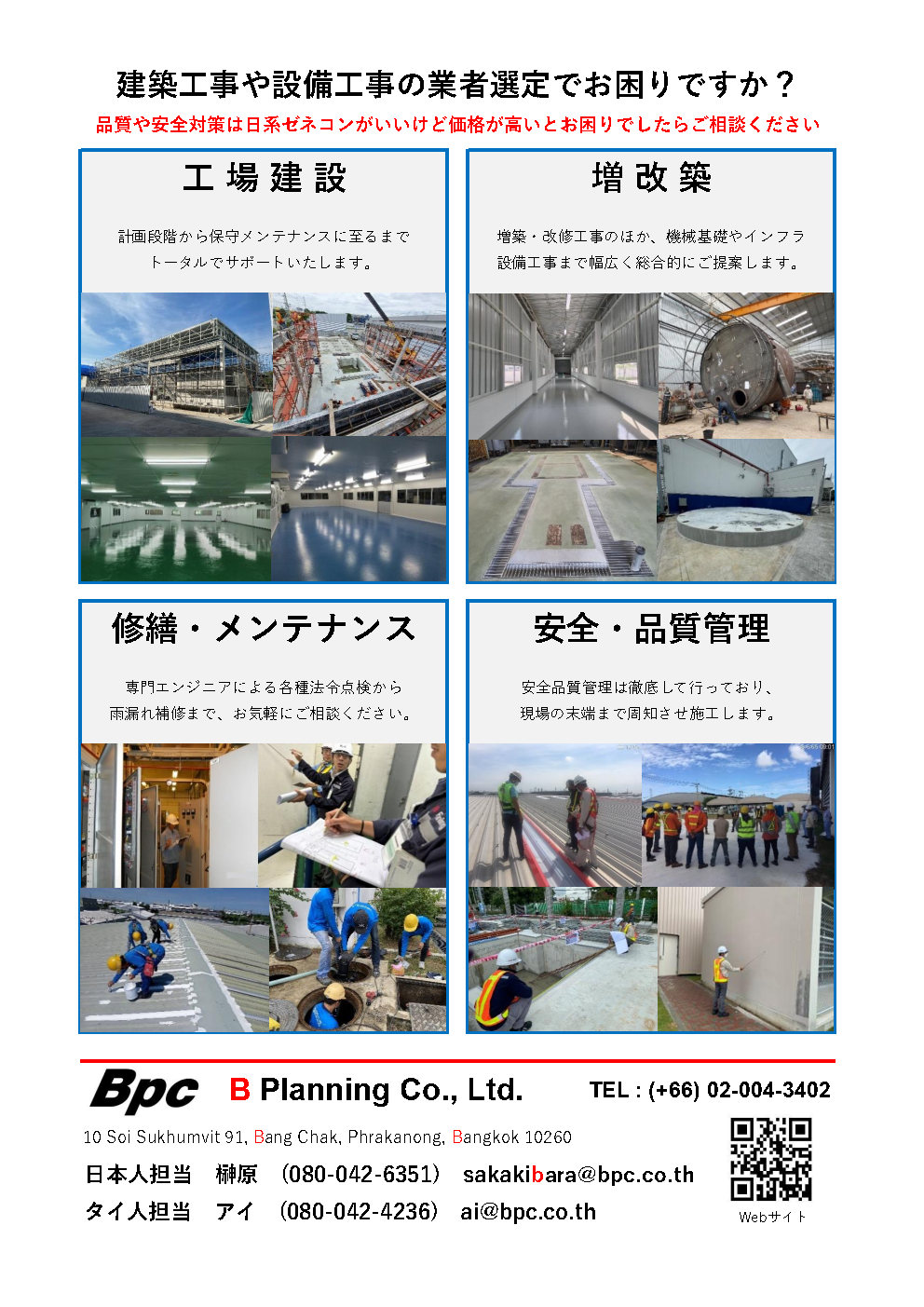 【Bプランニング】 タイ国にて工場倉庫の総合建設・増築・改修・メンテナンス工事業